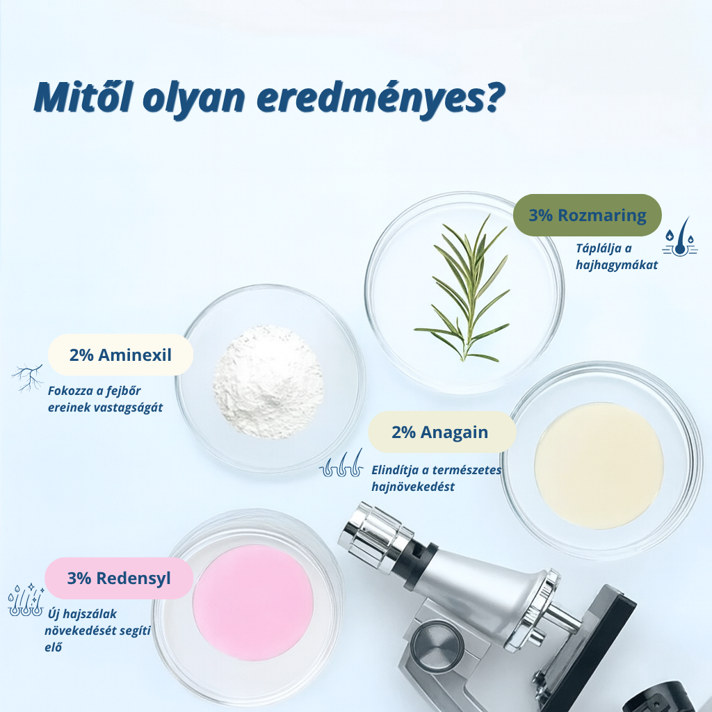 Szérumunk hatékonyságát a klinikailag igazolt összetevők: Rozmaring, Redensyl, Anagain és Aminexil biztosítják. Ezek a természetes hatóanyagok együtt serkentik a hajhagymák működését, fokozzák a vérkeringést és támogatják az új hajszálak növekedését. Így hajad nemcsak dúsabbnak, hanem egészségesebbnek is tűnik.